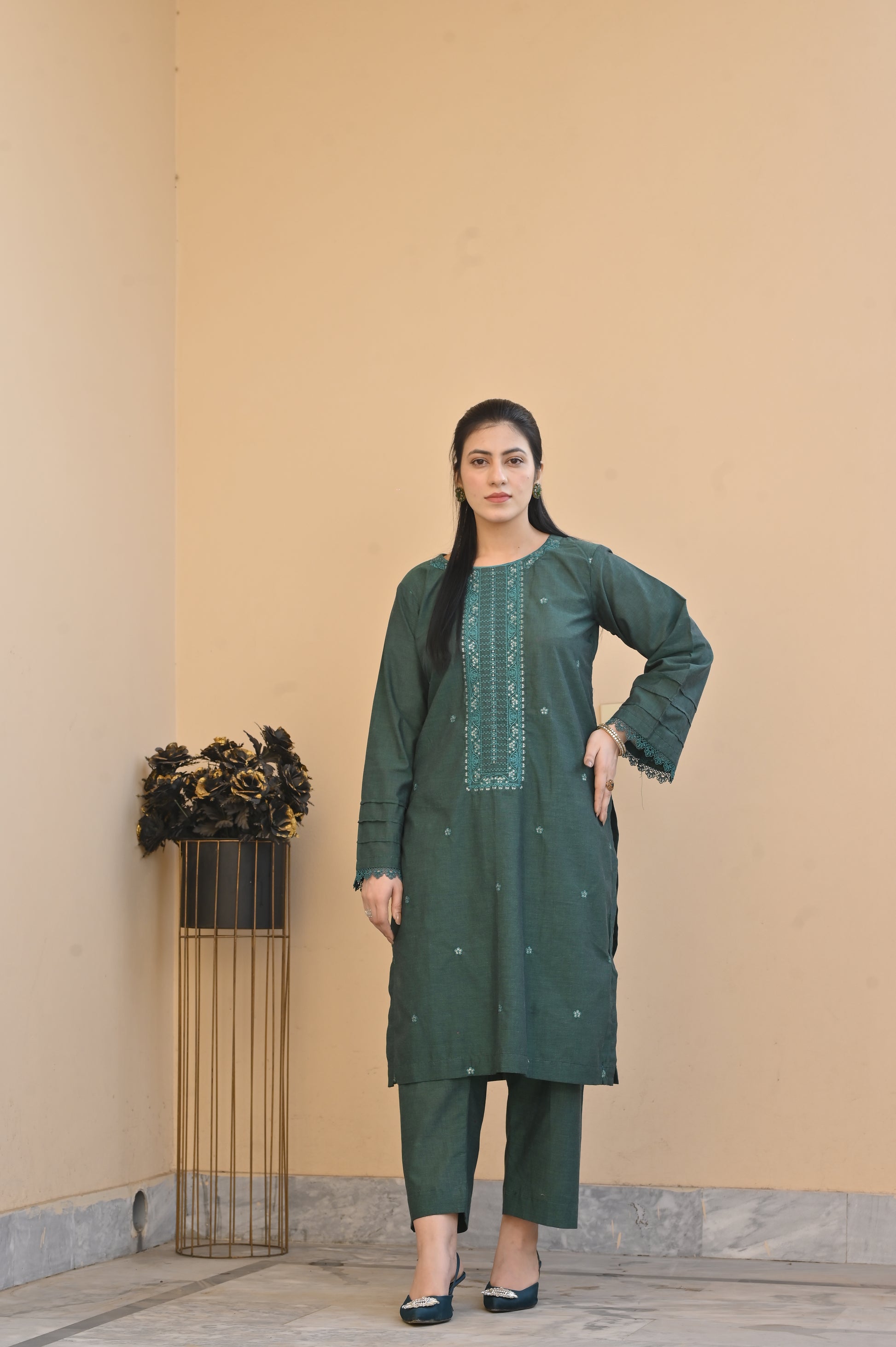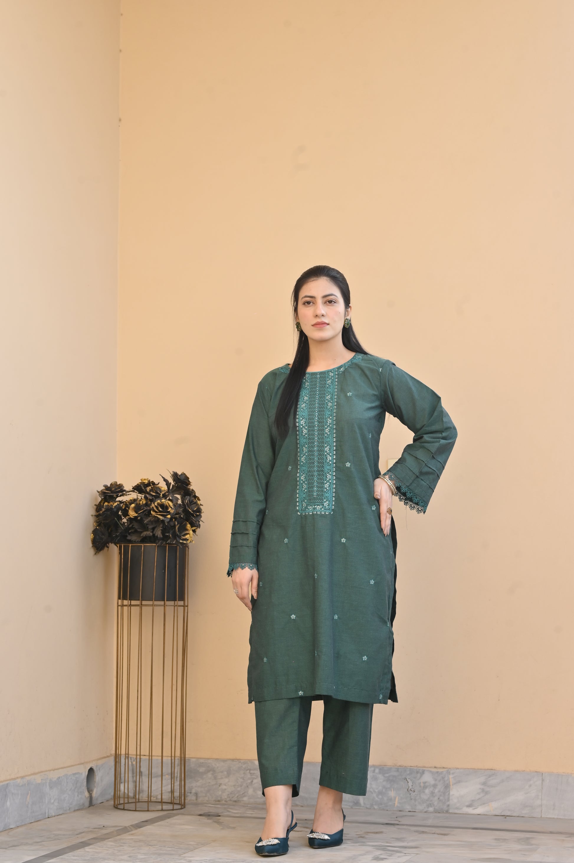 Stay effortlessly stylish with this 2-Piece Embroidered Stitched Women’s Suit (GREEN). Designed in premium blended cotton fabric, this outfit offers a perfect balance of comfort and elegance. The subtle gray shade is beautifully highlighted with fine embroidery, making it a versatile choice for both casual and semi-formal wear.