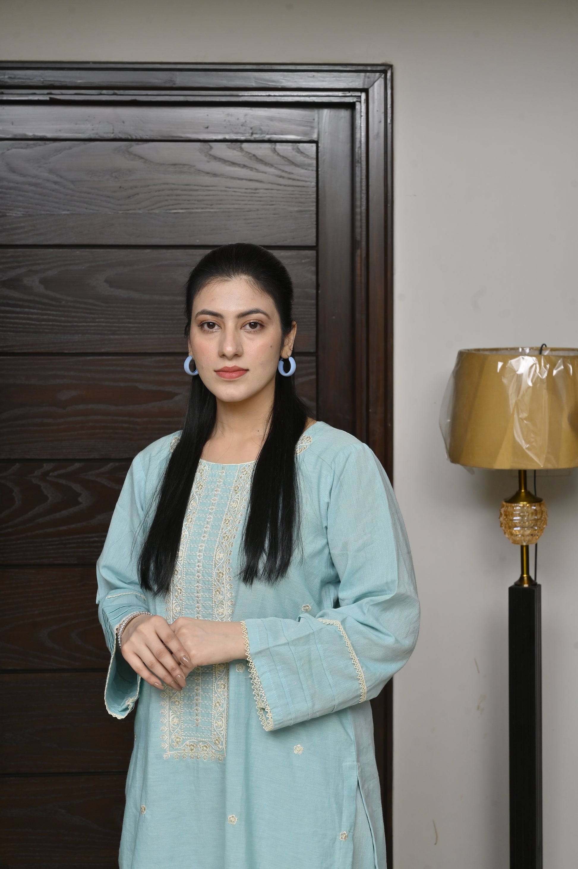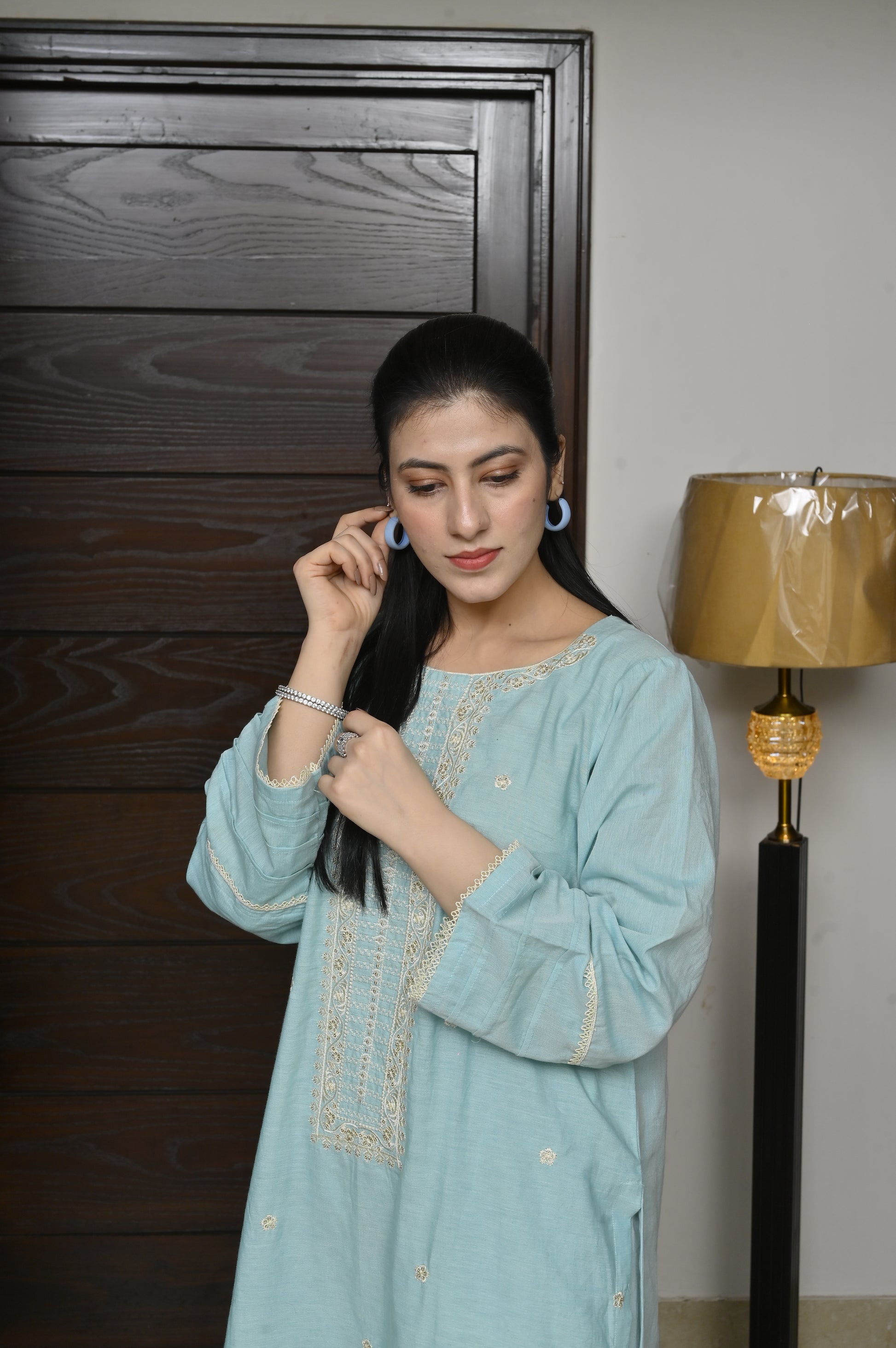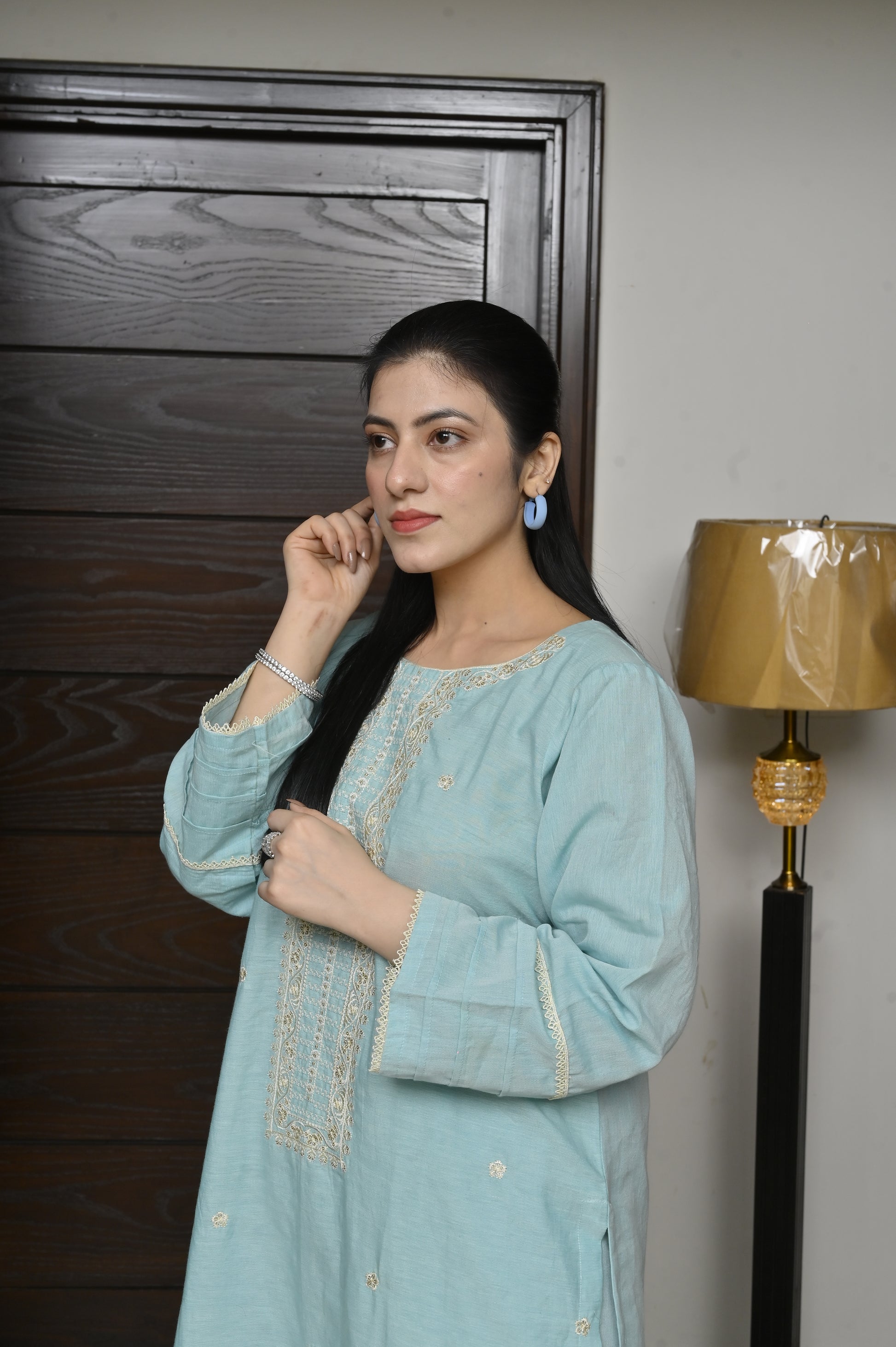 Stay effortlessly stylish with this 2-Piece Embroidered Stitched Women’s Suit (Soft Blue). Designed in premium blended cotton fabric, this outfit offers a perfect balance of comfort and elegance. The subtle gray shade is beautifully highlighted with fine embroidery, making it a versatile choice for both casual and semi-formal wear.